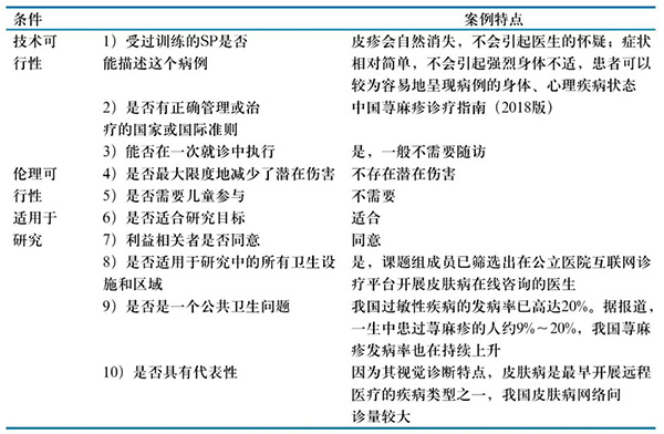 标准化病人(standardized patients,SP),指那些经过标准化、系统化培训后,能准确表现病人的实际临床问题的正常人或病人。该方法因单盲、准确、客观、可比等优势,已应用于对基层医疗机构、药房、公立医院和民营医院的比较等质量评估中。目前本研究探索性地将标准化病人法应用于互联网诊疗服务质量评价中,从高校招募5名标准化病人,通过培训让他们一致地呈现荨麻疹病例(病例选择见表1),并记录互联网就诊全过程。