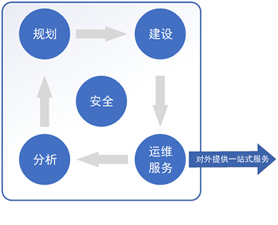 按照这种思路优化部门组织架构,各科室之间就不是传统的并列关系,而是信息系统全生命周期中前后衔接关系。如下图所示,部门职责形成一个闭环,并通过客户服务中心对外提供一站式服务。