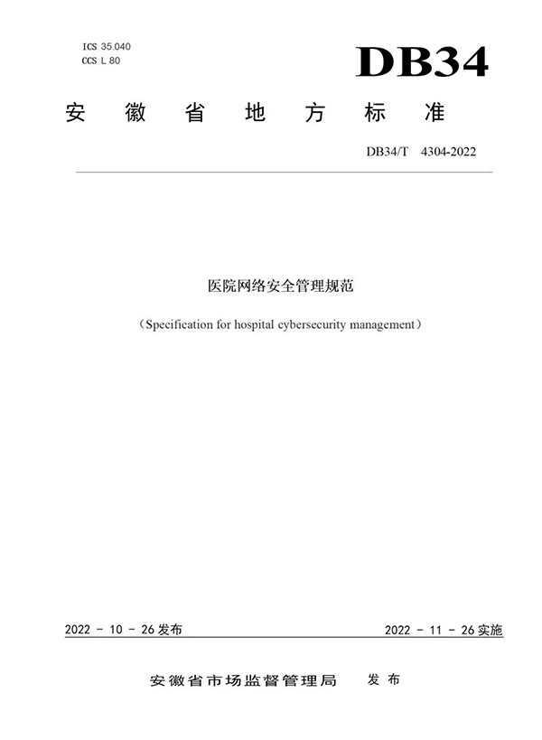11月26日,安徽省市场监督管理局批准发布由安徽医科大学第一附属医院牵头的《医院网络安全管理规范》(标准号:DB34/T 4304-2022),并于当日生效。