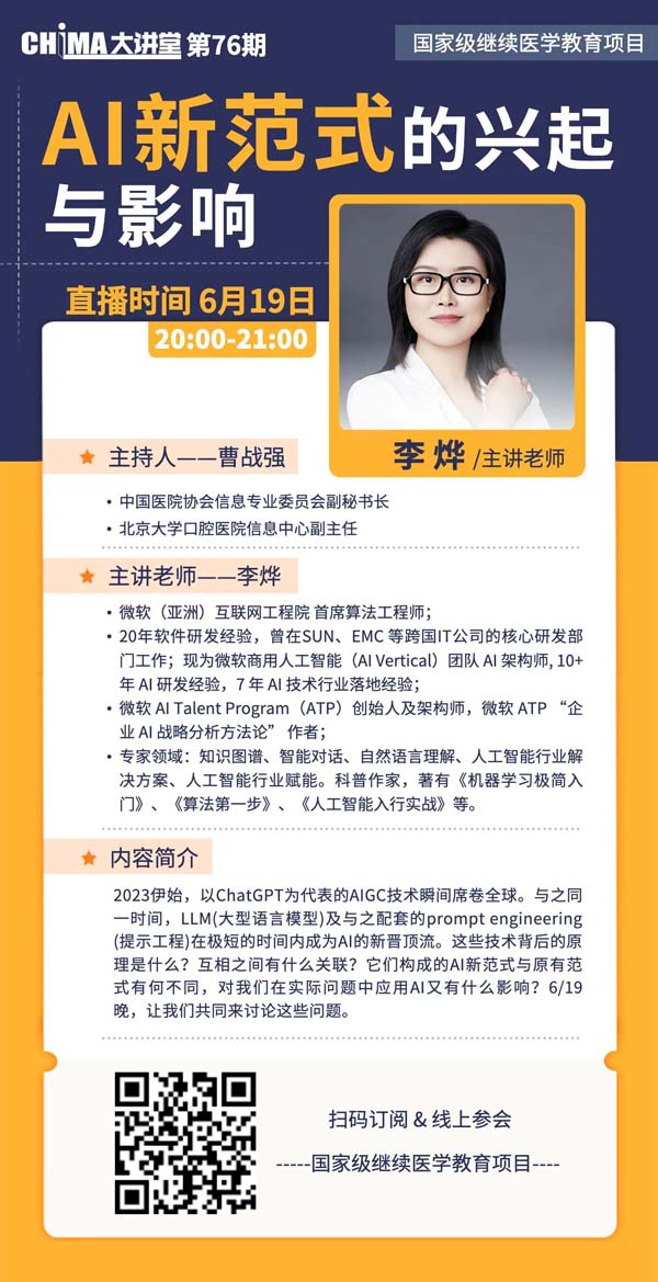 2023年伊始,以ChatGPT为代表的AIGC技术瞬间席卷全球。与之同一时间,LLM(大型语言模型)及与之配套的prompt engineering(提示工程)在极短的时间内成为AI的新晋顶流。这些技术背后的原理是什么?互相之间有什么关联?它们构成的AI新范式与原有范式有何不同?对我们在实际问题中应用AI又有什么影响?6月19日晚20:00召开的CHIMA大讲堂将对上述话题展开探讨。本期大讲堂由CHIMA副秘书长、北京大学口腔医院信息中心副主任曹战强主持,微软(亚洲)互联网工程院首席算法工程师李烨主讲。