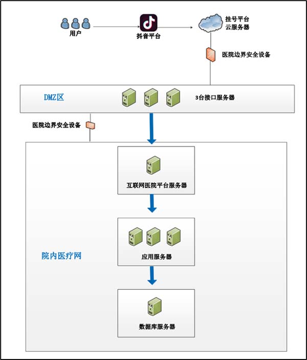 我院抖音挂号小程序系统架构基于抖音平台进行开发,具有线上挂号、缴费、报告查询等功能。在抖音APP搜索并进入小程序后,相关应用服务通过H5页面方式从抖音平台跳转到至我院挂号平台云服务器上。医院内DMZ区上部署了3台服务器做负载均衡,挂号平台云服务器与院内DMZ区之间部署了医院边界安全设备,以保证业务数据的安全性。院内DMZ区的3台服务器通过WebService方式与医院内部互联网医院平台服务器进行数据交互。医院内部的应用服务器与数据库服务器分开,保证业务数据的连续性和安全性。系统架构见图1。