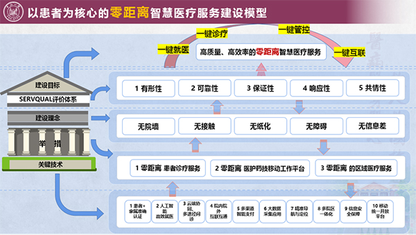 在建设过程中,通过深入分析院内门诊与住院运营情况,梳理患者的就医行为和就医诉求,总结出三类患者的诉求画像:病情稳定的慢病患者,病情发生变化的普通患者,急危重症、疑难病症患者。分析发现远程化、延续化、精准化、无纸化、无障碍、高效率是如今高质量医疗服务提升方向,为提升服务质量,提出“零距离”服务理念,梳理出改善服务行动方案。