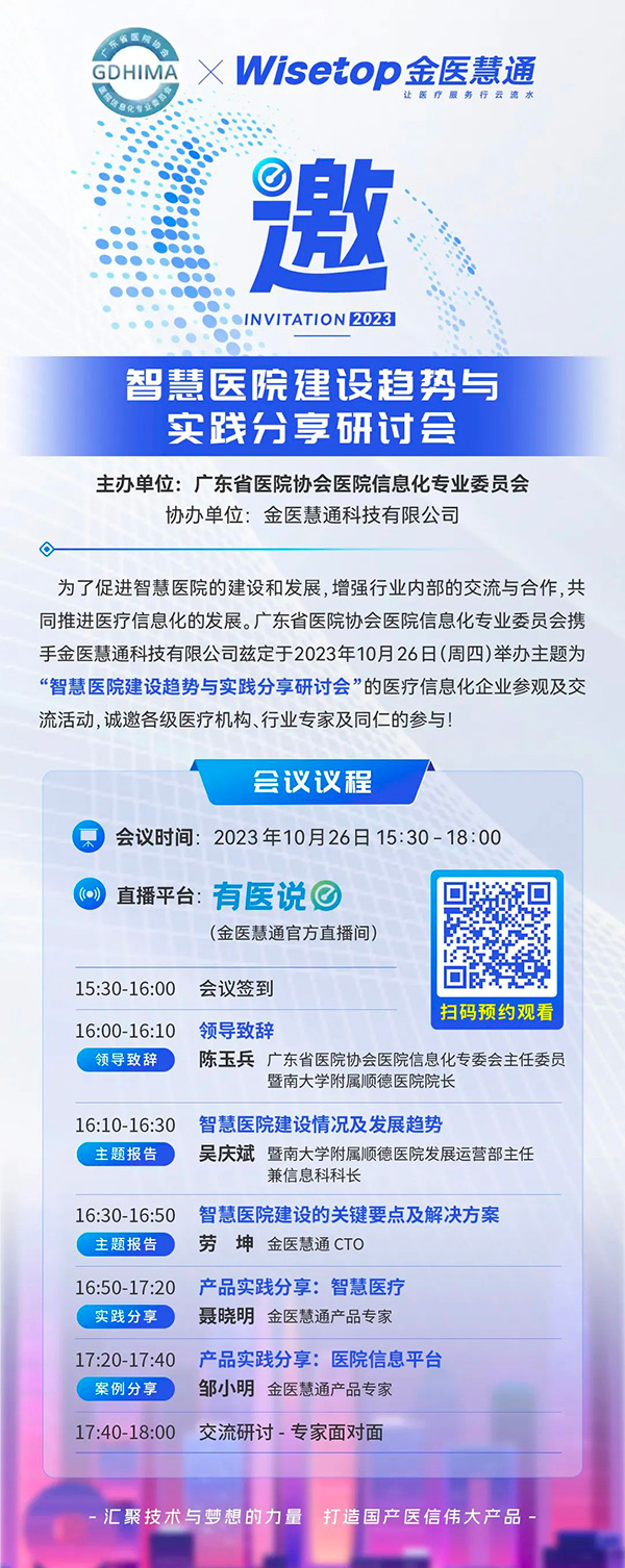 为促进智慧医院的建设和发展,增强行业内部的交流与合作,共同推进医疗信息化的发展。广东省医院协会医院信息化专业委员会定于2023年10月26日举办“智慧医院建设趋势与实践分享”主题研讨交流,诚邀各级医疗机构、医疗信息化行业专家及同仁的参与和收看!